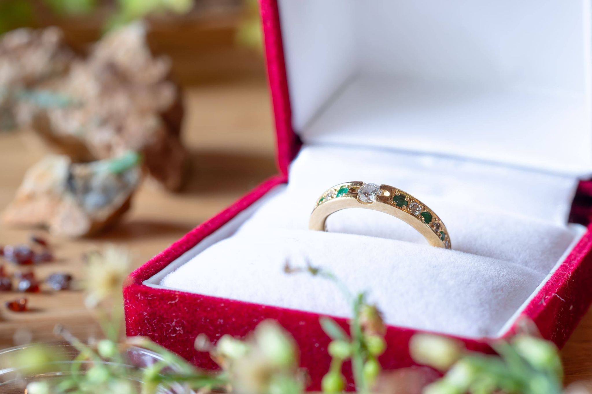 彼女の誕生石(5月)であるエメラルドを求めて、ノルウェーへ旅に出ました。滞在期間の全ての時間をエメラルド採掘に費やし、なんとか採掘することができました。採掘した複数のエメラルドを研磨し、世界で一つだけの婚約指輪を手作りして、プロポーズすることができました。