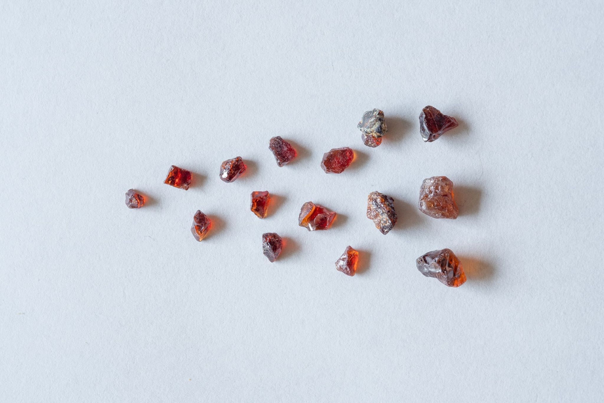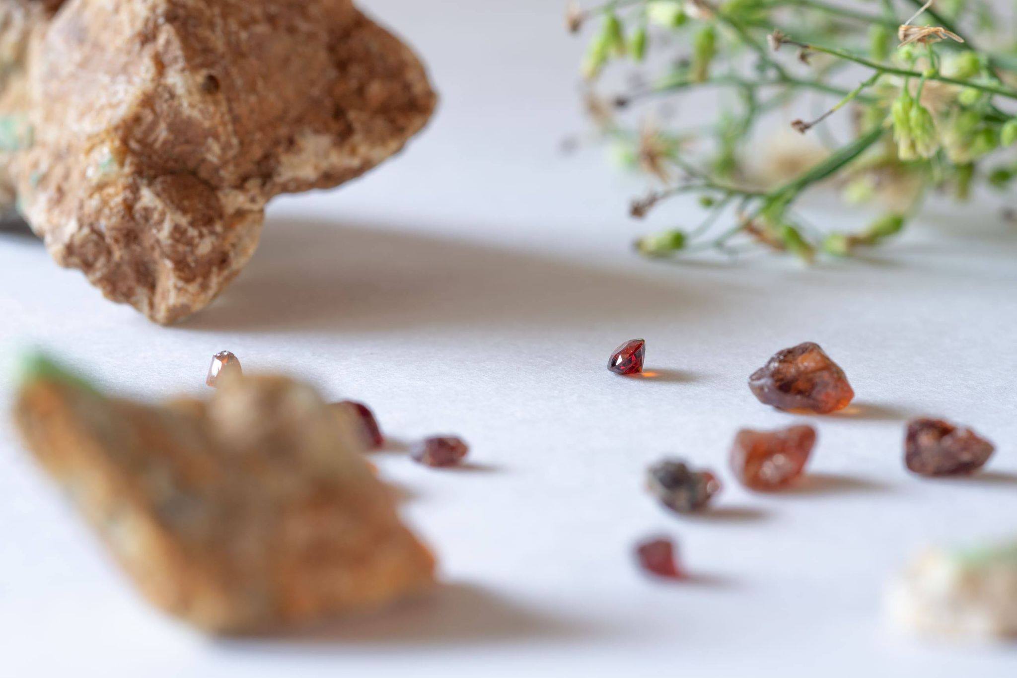 カンボジアへ行き、1月の誕生石であるガーネットを採掘しました。観光地でもなんでもない田舎町の小川で拾った原石を磨き上げ、こんなにも綺麗な宝石のルースとなりました。